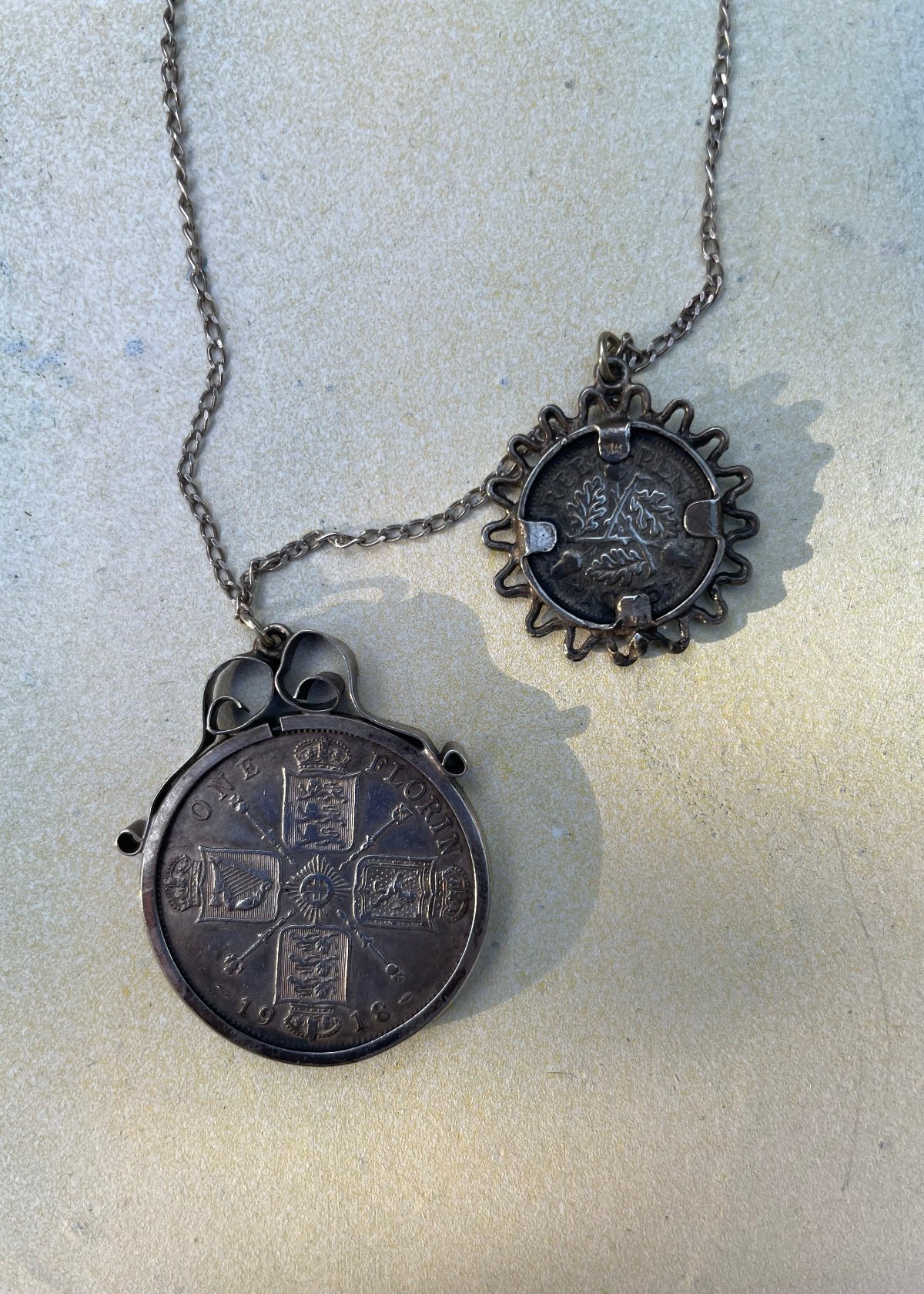 The larger pendant is a silver One Florin coin 1918 - 3cm Diameter