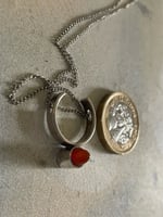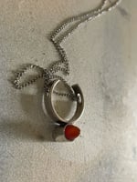 A beauty small Modernist Sterling Silver pendant, designed in 1960/70s by Elis Kauppi for Kupittaan Kulta Oy, Turku, Finland. A partially open silver band has a setting attached to bottom, holding a domed, hand-carved carnelian stone inside, The band has openings on both side, through which the fine Silver chain runs.